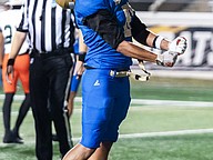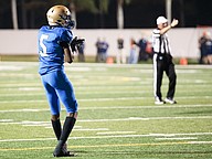 Mainland wide receiver Jaden "Melo" Parks (5) catches a pass in the Region 1-5A semifinal against Mosley on Friday, Nov. 21 at the Daytona Stadium. Photo by Michele Meyers