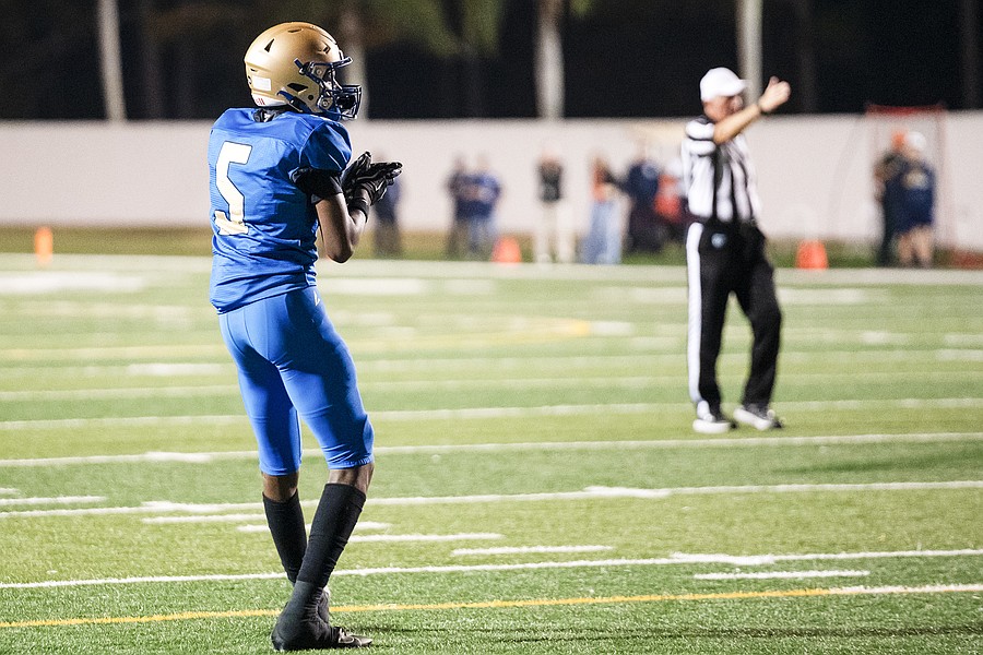Mainland wide receiver Jaden "Melo" Parks (5) claps getting a first down in the Region 1-5A semifinal against Mosley on Friday, Nov. 21 at the Daytona Stadium. Photo by Michele Meyers