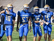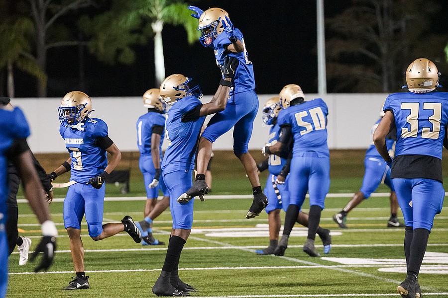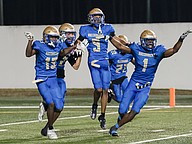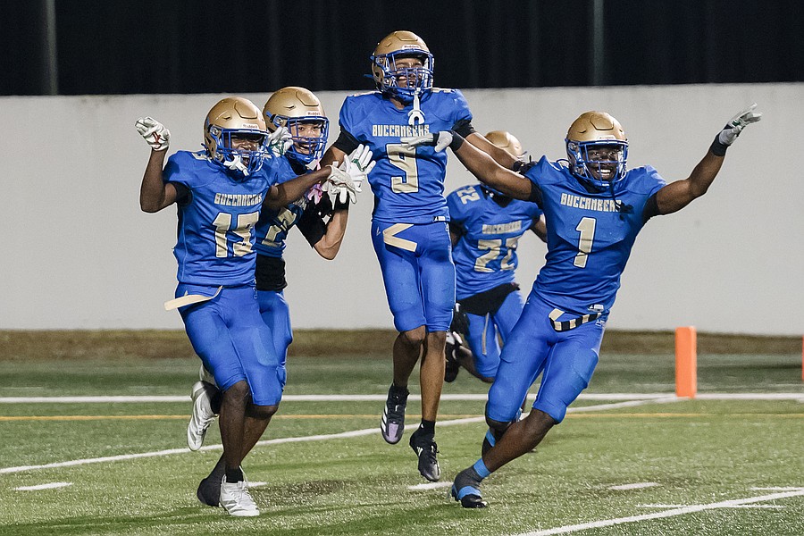 Mainland's defense (left to right) Jhavin "Bubba" Westbrook, Marcus Day, Denzel Shropshire, Tyrell Edwards III and Dennis "Tank" King III celebrate interrupt after they break up another pass in the Region 1-5A semifinal against Mosley on Friday, Nov. 21 at the Daytona Stadium. Photo by Michele Meyers