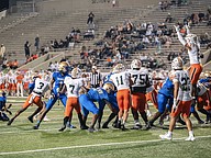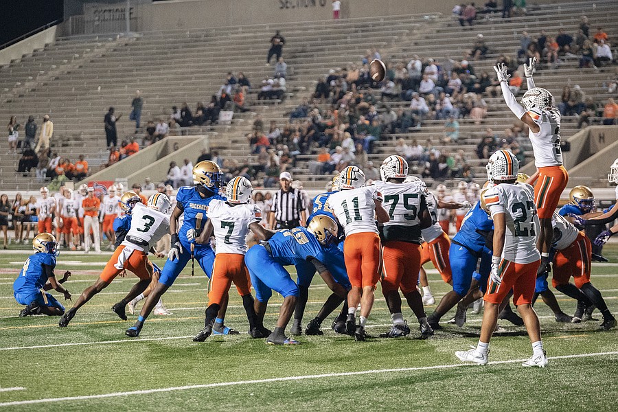 Mosley's Carson Griffin (right) attempts to block the kick by Mainland's David Aponte in the Region 1-5A semifinal on Friday, Nov. 21 at the Daytona Stadium. Photo by Michele Meyers