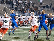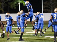 Mainland's Jaden "Melo" Parks lifts Theo Bryant (center) after Bryant runs for a 97-yard touchdown in the Region 1-5A semifinal against Mosley on Friday, Nov. 21 at the Daytona Stadium. Photo by Michele Meyers