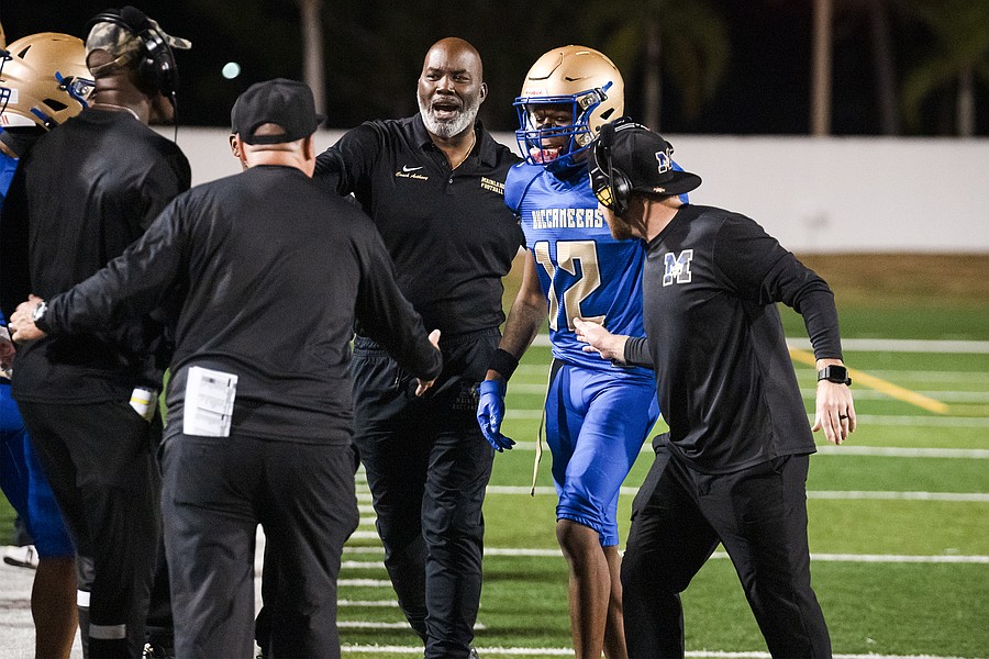 Mainland athletic director Terrence Anthony (center) and the coaches congratulate Theo Bryant (12) after Bryant runs for a 97-yard touchdown in the Region 1-5A semifinal against Mosley on Friday, Nov. 21 at the Daytona Stadium. Photo by Michele Meyers