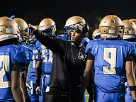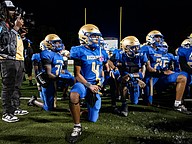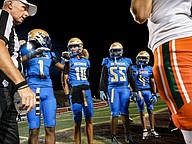 Mainland players listen to head coach Jerrime "Squatty" Bell after their win against Mosley in the Region 1-5A semifinal on Friday, Nov. 21 at the Daytona Stadium. Photo by Michele Meyers