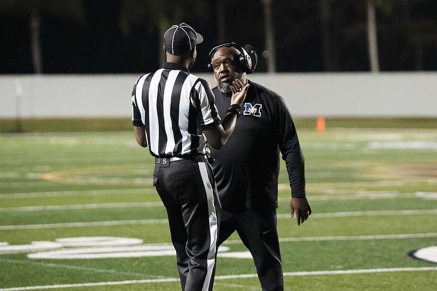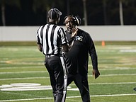 Mainland head coach Jerrime "Squatty" Bell challenges a call during the Region 1-5A semifinal against Mosley on Friday, Nov. 21 at the Daytona Stadium. Photo by Michele Meyers