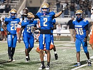 Mainland players Sebastian Johnson (10), Amarion Lane (53), Braylyn Simmons (6) and Kadin Flores (15) celebrate Simmons' touchdown during the Region 1-5A semifinal game against Mosley on Friday, Nov. 14 at the Daytona Stadium. Photo by Michele Meyers