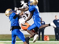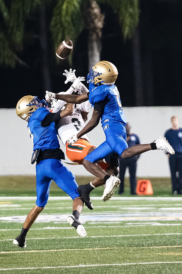 Mainland defensive backs Marcus Day (left) and Jhavin "Bubba" Westbrook interrupt a pass to Mosley's Carson Griffin (center) in the Region 1-5A semifinal against Mosley on Friday, Nov. 21 at the Daytona Stadium. Photo by Michele Meyers