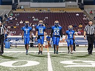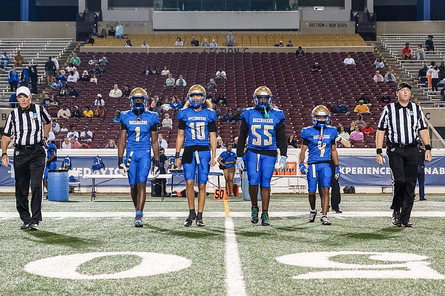 Mainland team captains Dennis "Tank" King III (1), Sebastian Johnson (10), Chevin Davis Jr. (55), and Christian Cooper (4) take the field before the Region 1-5A semifinal game against Mosley on Friday, Nov. 14 at the Daytona Stadium. Photo by Michele Meyers