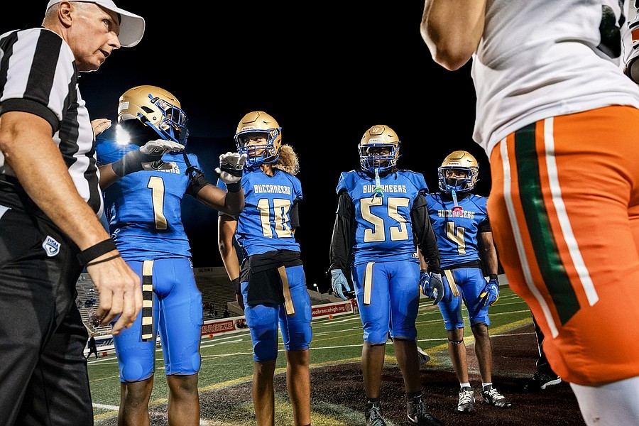 Mainland team captain Dennis "Tank" King III (1) talks to fellow captains Sebastian Johnson (10), Chevin Davis Jr. (55) and Christian Cooper (4) after they win the coin toss before the Region 1-5A semifinal game against Mosley on Friday, Nov. 14 at the Daytona Stadium. Photo by Michele Meyers