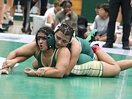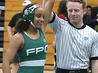 FPC's Juliana Mills takes third place in the 120-pound class. Mills automatically won the consolation final because her opponent had already wrestled the maximum of six matches during the day. Photo by Brent Woronoff