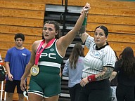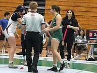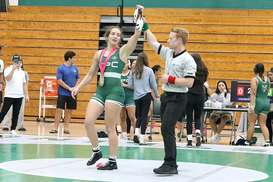 FPC's Alisha Vilar shakes her opponent's hand after winning the 155-pound championship match, as her sister — former FPC wrestler Ana Vilar — gets ready to drape the first-place medal around Alisha's neck. Photo by Brent Woronoff