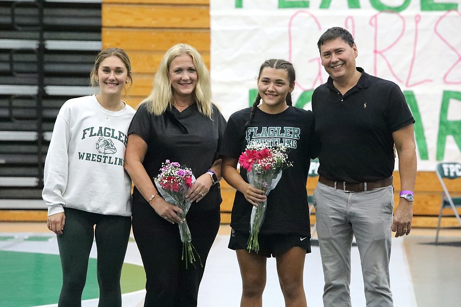 Alexa Calidonio (second from right) with her sister Cristina and parents Kim and Elli during Senior Night presentations at the Flagler Rotary Girls Wrestling Invitational at FPC. Photo by Brent Woronoff