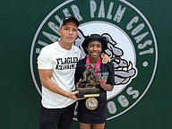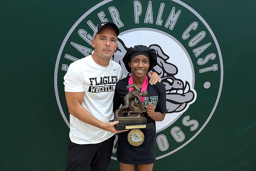 FPC coach David Bossardet with Joslyn Johnson, who won the Outstanding Wrestler Award at the Flagler Rotary Girls Wrestling Invitational. Photo by Brent Woronoff