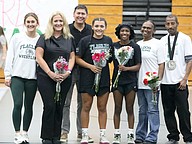 FPC seniors Alexa Calidonio and Joslyn Johnson with their families at the Senior Night presentation preceding the Flagler Rotary Girls Wrestling Invitational championship round. Photo by Brent Woronoff