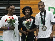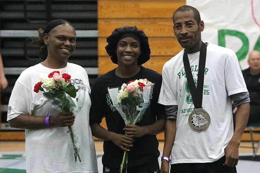 Joslyn Johnson and her parents during Senior Night presentations at the Flagler Rotary Girls Wrestling Invitational at FPC. Photo by Brent Woronoff