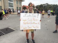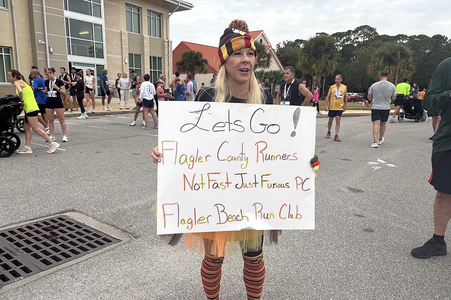 Darla Govani supports her runners' groups. Govani ran in the Skunk Ape Marathon in DeBary on her 50th birthday on Nov. 23 and was still recovering, so she did not run in the Feet to Feast 5K, but she rode her bike to various vantage points of the course and cheered on her friends. Photo by Remy Battles