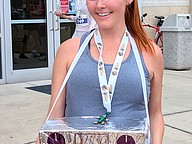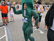 Deb Blair said her homemade green bean costume was quite hot to run in, even with a fan inside. Blair makes her own costumes every year for the Feet to Feast 5K. Photo by Brent Woronoff