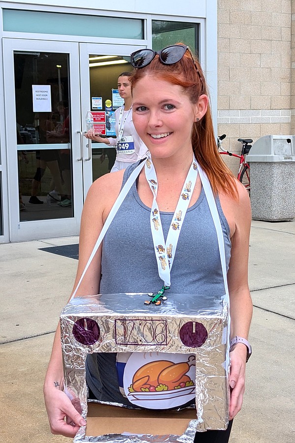 Brielle Mahannah has a baby in the oven — she's nine months pregnant, due on Dec. 6 — and finished the race in 28 minutes, 36 seconds, her slowest 5K ever. For her Thanksgiving themed costume, she had a turkey in the oven. Photo by Brent Woronoff