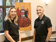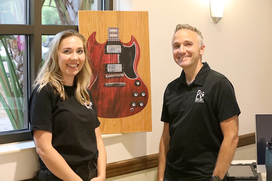 Lindesy and Justin Hein of PixelWall Designs pose next to a direct-to-wall print. Photo by Brent Woronoff