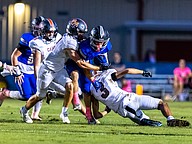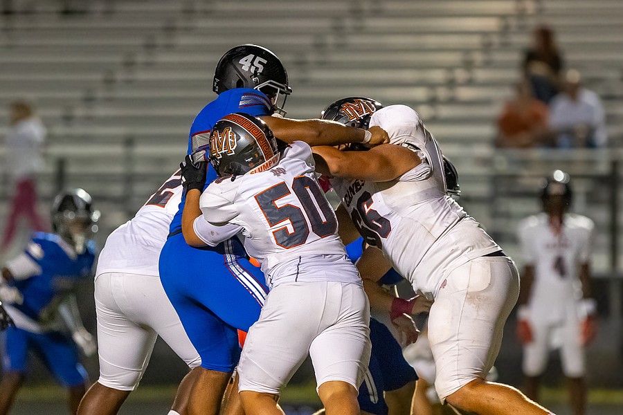 Mount Dora double-teams Matanzas defensive end Jordan Theus-Vale (45). Photo by Keishia McLendon