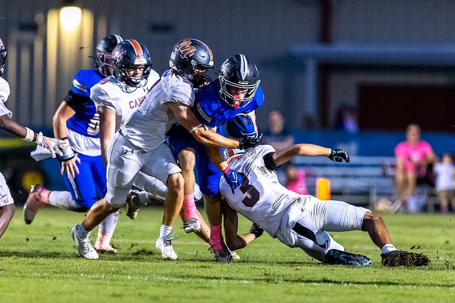 Mount Dora players swarm Matanzas running back Wiley Conner (34). Conner ran for 99 yards on 28 carries. Photo by Keishia McLendon