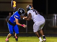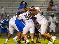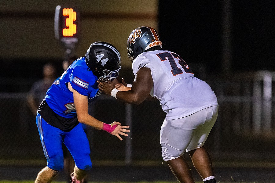 Matanzas linebacker Landon Haston (44) tries to get by Mount Dora lineman Tyger Morris. Photo by Keishia McLendon