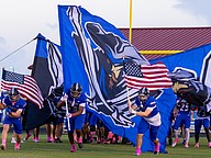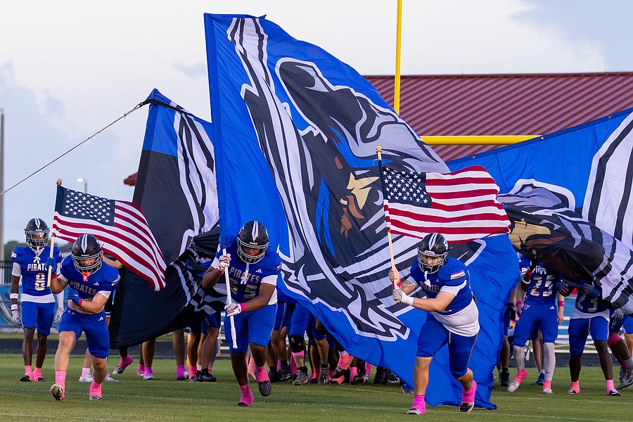 Matanzas football players arrive on the field with flags waving. Photo by Keishia McLendon