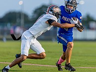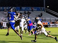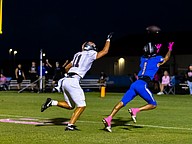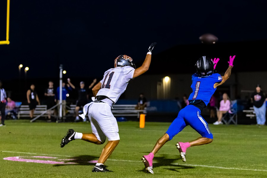 Matanzas receiver Ladarien Baker, right, tries to make a one-handed catch. Photo by Keishia McLendon