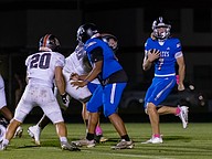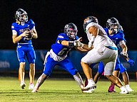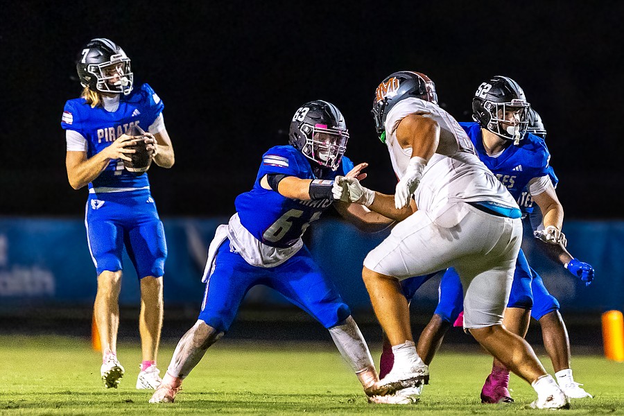 Matanzas offensive linemen Frank Giovannucci (63) and Logan Walker (52) block for quarterback Cole Walker. Photo by Keishia McLendon