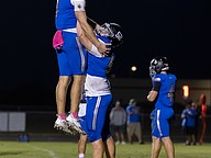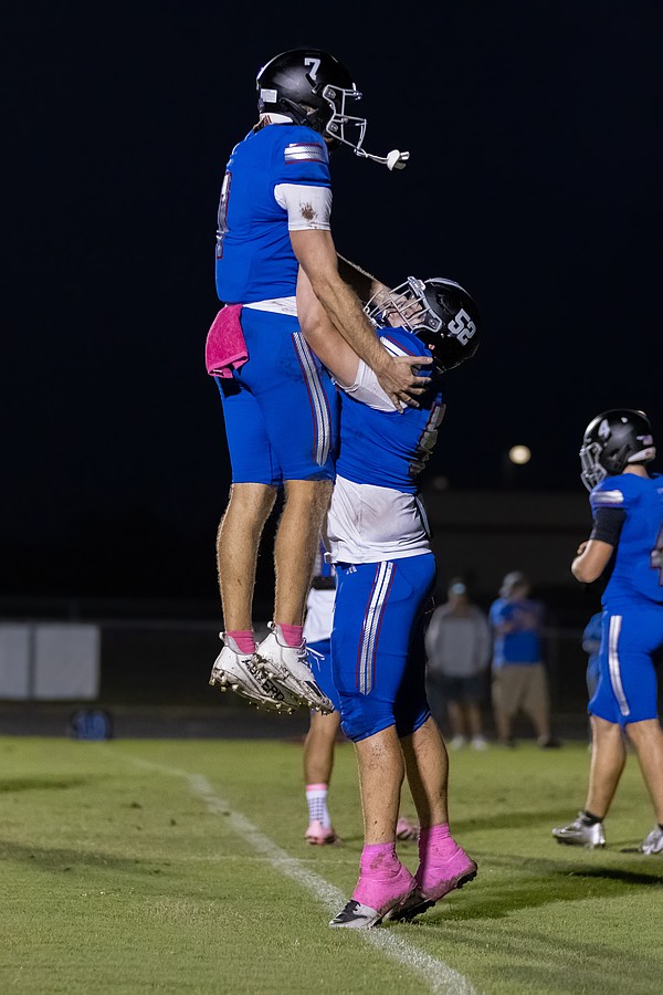 Matanzas center Logan Walker (52) hoists Cole Walker in the air after the quarterback scored on a 1-yard run in the second quarter. Photo by Keishia McLendon