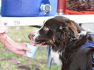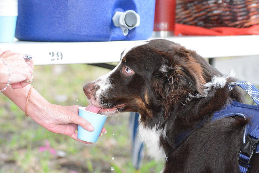 A dog drinks water after finishing the 1-Mile Pet Friendly Fun Walk at the Pink Army 5K. Photo by Hannah Hodge