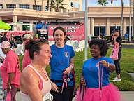 Flagler Palm Coast High School students Kalista Chadwell and Zenirah Nonord had out medals to runners as they finish the Pink Army 5K. Photo by Brent Woronoff