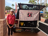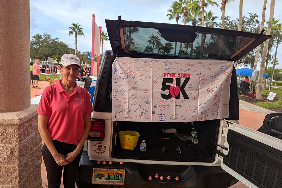 Linda Graham of Florida Cancer Specialists stands next to a Pink Army 5K banner signed by cancer survivors in attendance. The Florida Cancer Specialists team will give the banner to oncologist Padmaja Sai, who was out of the country and missed the event. "We're going to surprise her with it when she gets back," Graham said. "She's treated probably 99% of the survivors here." Photo by Brent Woronoff