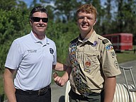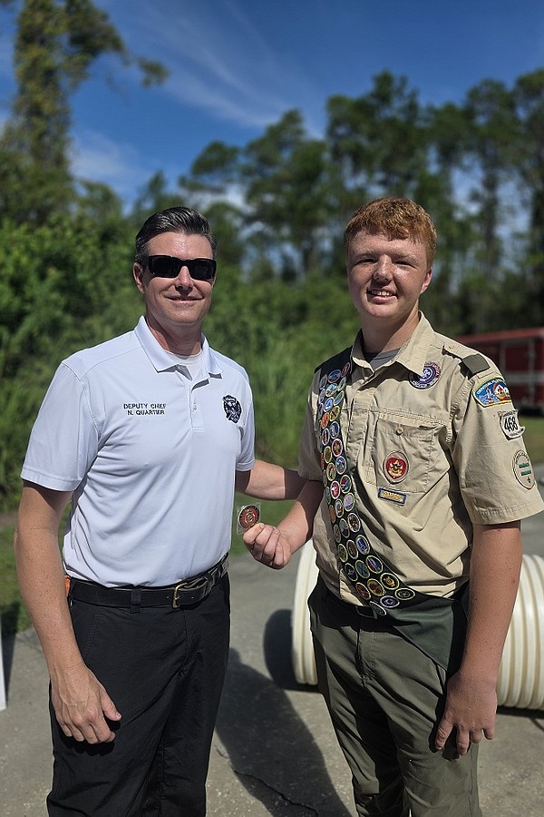 Ormond Beach Deputy Fire Chief Nate Quartier gives Robert "Trey" Mattingly III a chief's pin. Courtesy photo