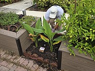 Mead contributed two mustard varieties that were cultivated from seed, and Campbell subsequently transplanted them into the garden beds. Mead also cut back the butterfly pea vine and Rico pulled weeds.