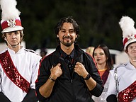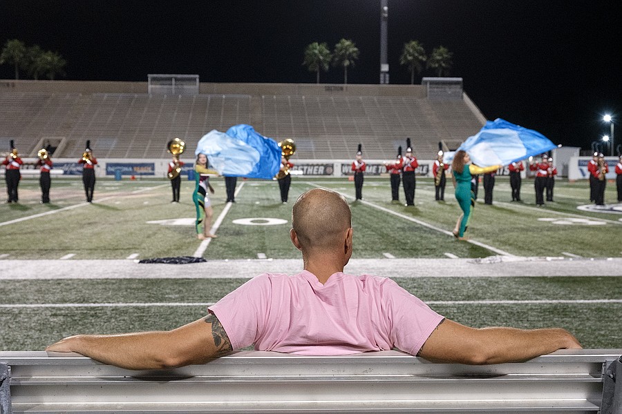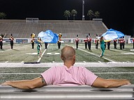 The Seabreeze principal Tucker Harris watches the marching band after the homecoming game win against Atlantic at the Daytona Stadium on Friday, Oct. 3. Photo by Michele Meyers