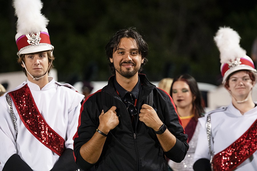 Seabreeze band director Michael Levanti (center) walks out with drum majors Britton Prewitt (left) and Emily Brooks-Schmoyer (right) before the Homecoming Court introductions at the Daytona Stadium on Friday, Oct. 3. Photo by Michele Meyers