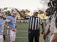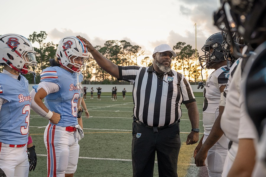 Seabreeze and Atlantic captains meet with the referee for the coin toss before the game at the Daytona Stadium on Friday, Oct. 3. Photo by Michele Meyers