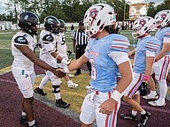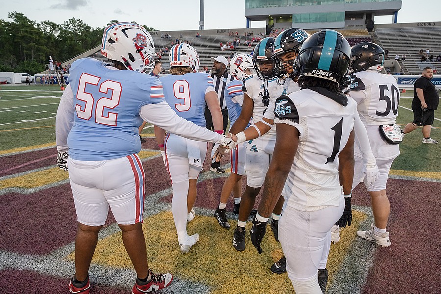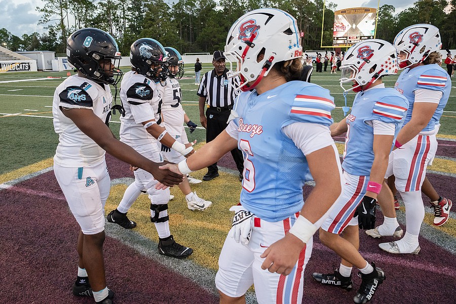 Seabreeze and Atlantic captains shake hands before the game at the Daytona Stadium on Friday, Oct. 3. Photo by Michele Meyers