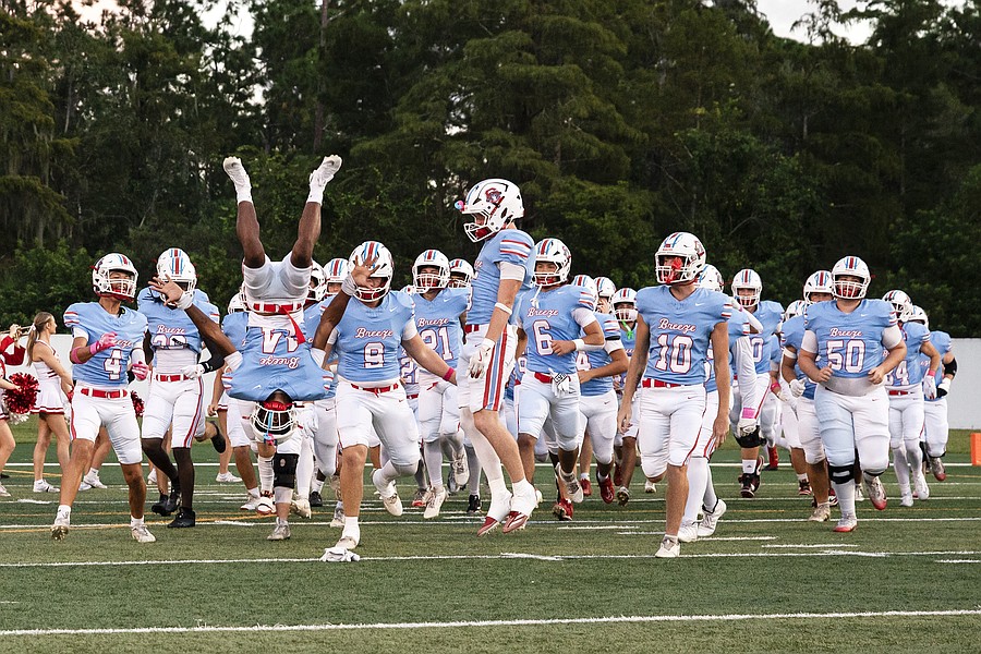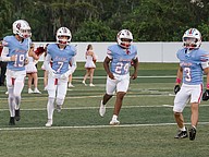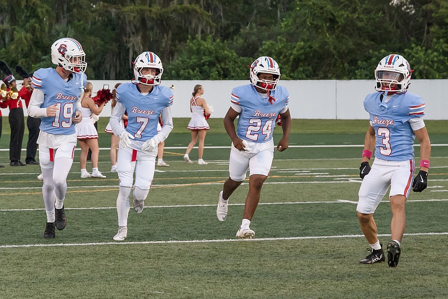Cason McDonald (19), Cash Kurz (7), Khalil Tennant (24) and Dean Hayes (3) take the field as Seabreeze is introduced before the game against Atlantic at the Daytona Stadium on Friday, Oct. 3. Phtoo by Michele Meyers