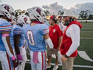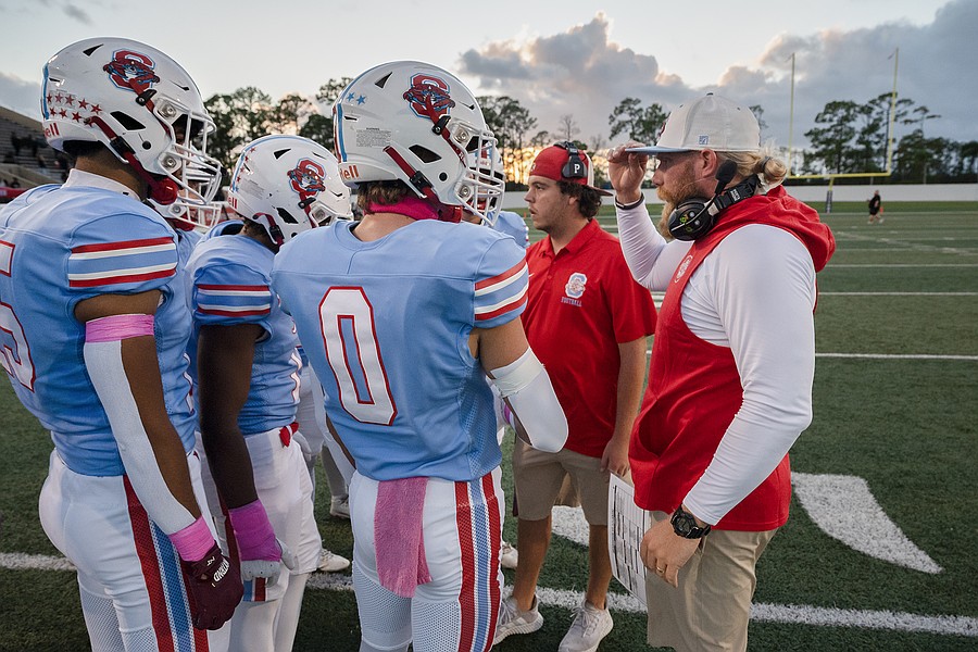Seabreeze head coach Mike Klein (right) and assistant coach Zeke Adkins (second from right) talk to the players before the agame against Atlantic at the Daytona Stadium on Friday, Oct. 3. Photo by Michele Meyers