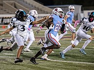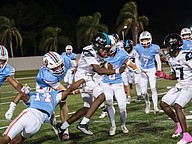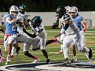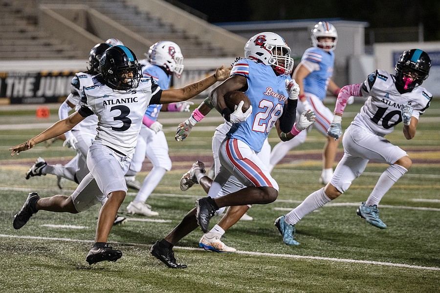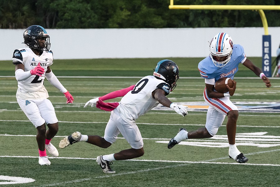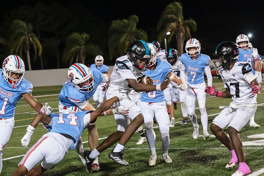 Seabreeze running back Logan Smith (left) is on the run as Atlantic players chase him down at the Daytona Stadium on Friday, Oct. 3. Photo by Michele Meyers