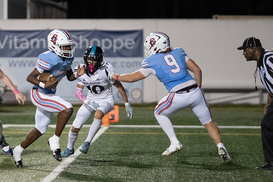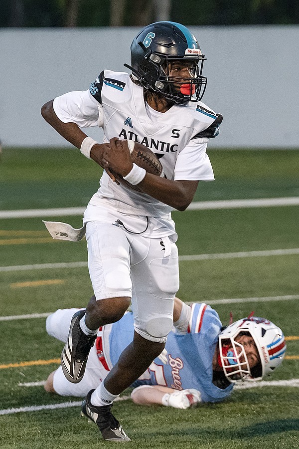 Atlantic quarterback Troy Reddin (6) charges through the Seabreeze defense at the Daytona Stadium on Friday, Oct. 3. Photo by Michele Meyers