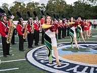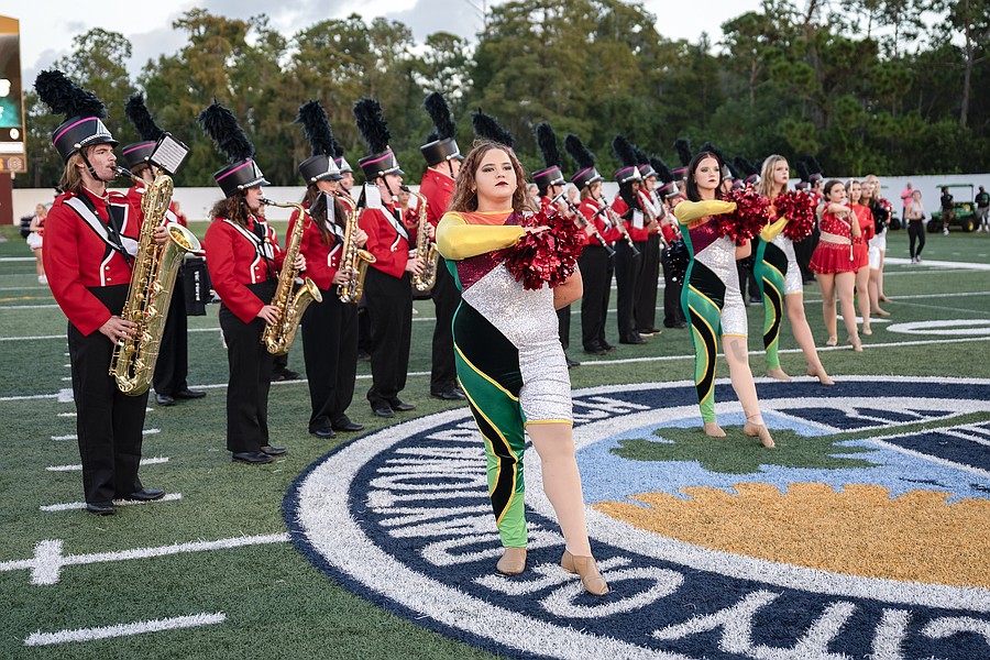 The Seabreeze marching band and color guard perform before the Homecoming game against Atlantic at the Daytona Stadium on Friday, Oct. 3. Photo by Michele Meyers