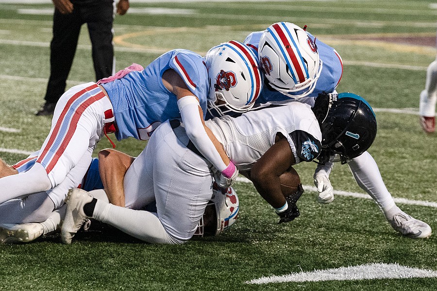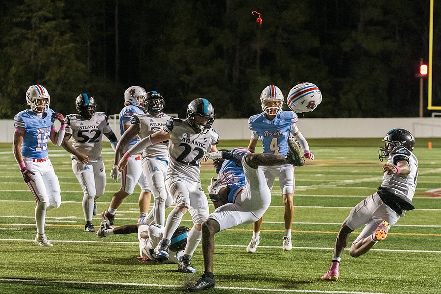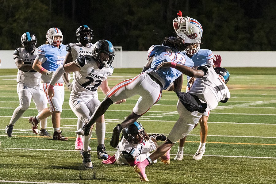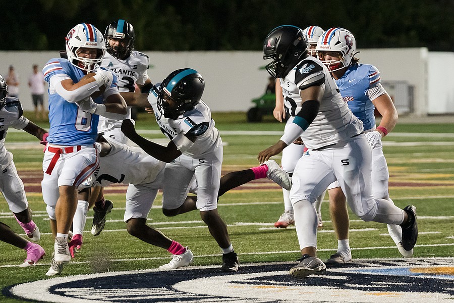 Seabreeze's Grant Losey (left), Cash Kurz (center) and Tristian Miller (bottom) take down Atlantic's Javonte Kennedy (1) at the Daytona Stadium on Friday, Oct. 3. Photo by Michele Meyers