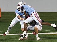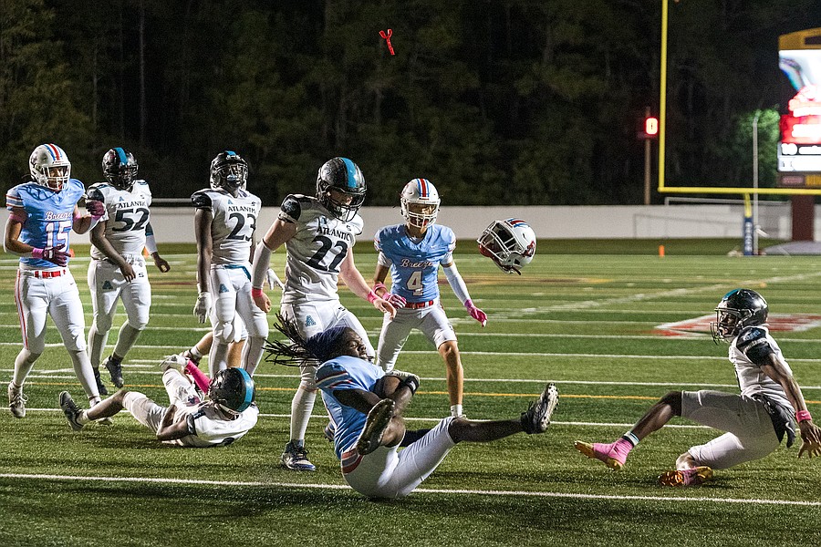 Seabreeze junior Jeremias George (28) suffers a helmet-popping tackle at the end zone in the game against Atlantic at the Daytona Stadium on Friday, Oct. 3. Photo by Michele Meyers