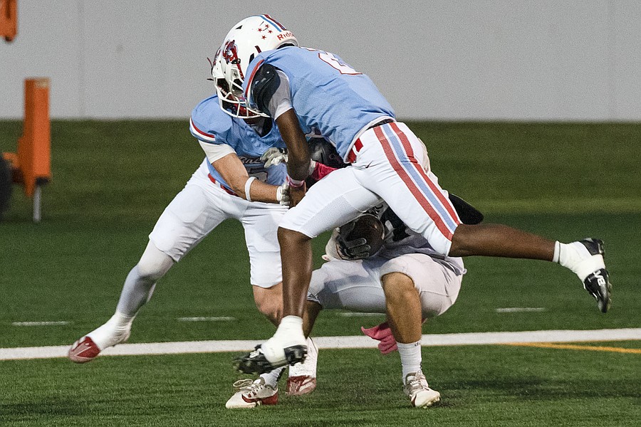 Seabreeze's Stephen Williams Jr. (center) and Owen O'Rourke (left) tackle Atlantic's Nicholas Piper (bottom) and force a safety for the Sandcrabs at the Daytona Stadium on Friday, Oct. 3. Michele Meyers