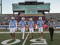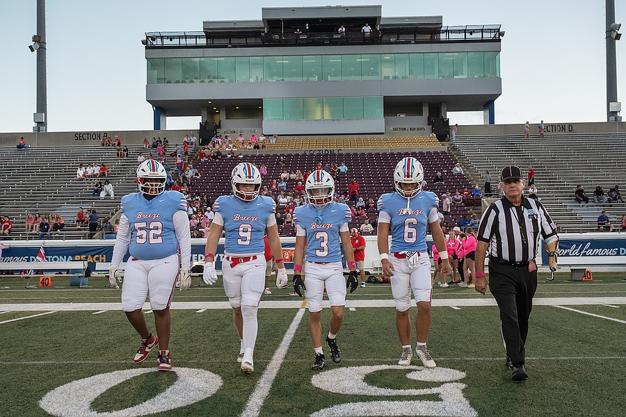 Seabreeze captains (left to right) James English, Matthew Wells, Dean Hayes and Logan Smith take the field to meet the Atlantic captains before the game at the Daytona Stadium on Friday, Oct. 3. Photo by Michele Meyers