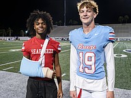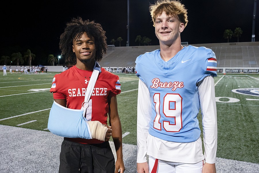 Seabreeze safety and running back Zach Voltaire (left) and kicker Cason MacDonald (right) hang out on the sidelines at the Atlantic game at the Daytona Stadium. Voltaire broke his arm recently and said he will know soon when he will be able to return to the game. Photo by Michele Meyers