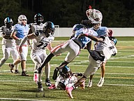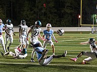 Atlantic quarterback Troy Reddin (6) avoids a tackle by Seabreeze's Owen O'Rourke (bottom) at the Daytona Stadium on Friday, Oct. 3. Photo by Michele Meyers