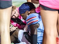 Seabreeze Allied Health Academy Director Kelley Lemon (center left) checks Jeremias George (center right) after he collapsed following a hard hit in the game against Atlantic at the Daytona Stadium on Friday, Oct. 3. Photo by Michele Meyers